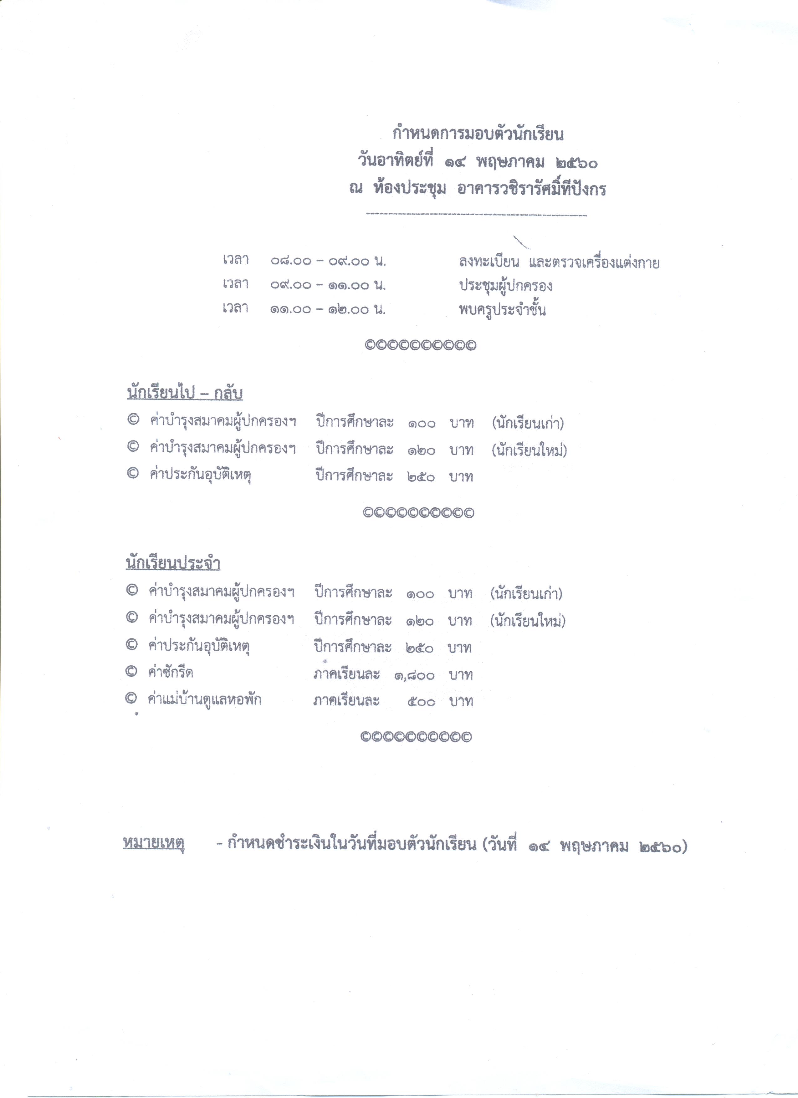 กำหนดการมอบตัวนักเรียนประจำปีการศึกษา 2560
