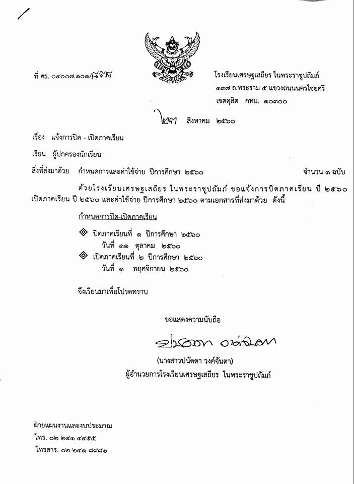 ประกาศเปิดปิดเรียน ปีการศึกษา 2560