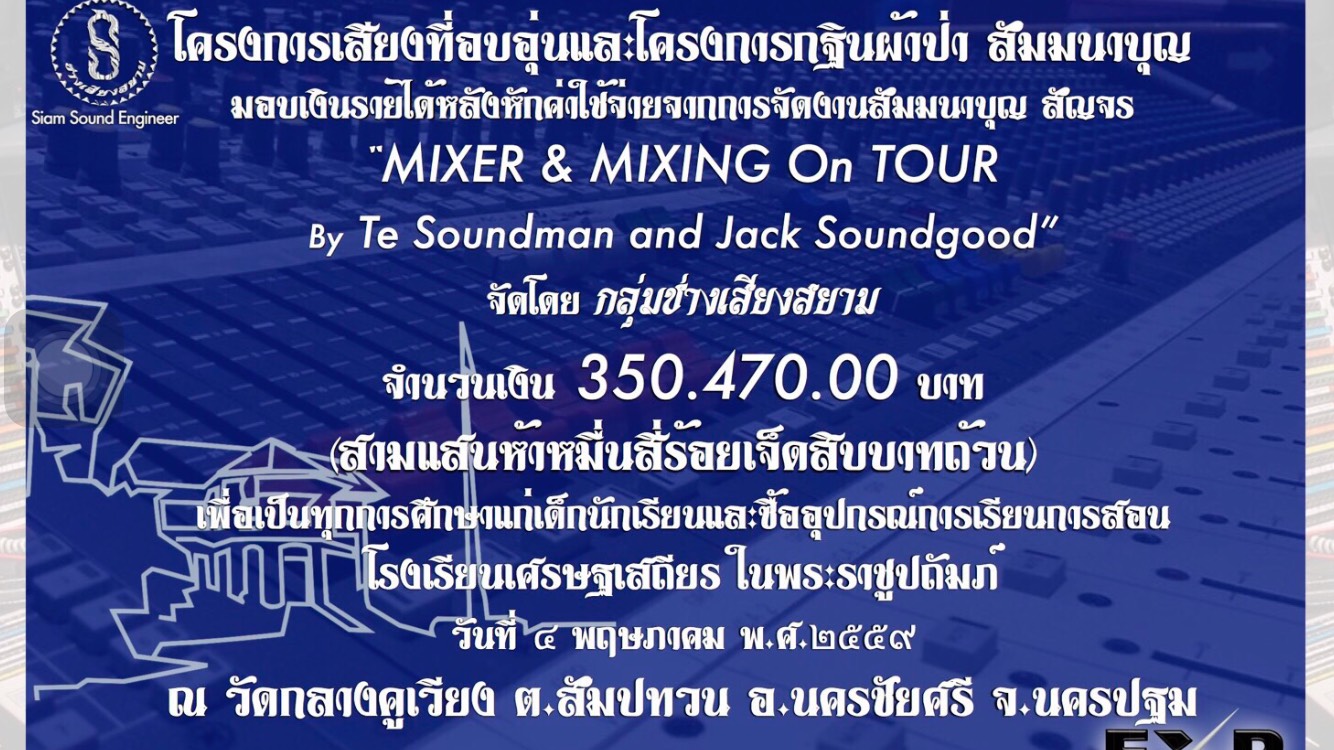 โครงการเสียงที่อบอุ่นและโครงการกฐินผ้าป่า สัมมนาบุญ มอบเงินรายได้หลังหักค่าใช้จ่ายจากการจัดงานสัมมนาบุญ สัญจร “MIXER&MIXING On TOUR BY Te Soundman and Jack Soundgood” จัดโดย กลุ่มช่างเสียงสยาม จำนวน 350,470 บาท วันที่ 4 พฤศภาคม 2559 ณ วัดกลางคูเวียง จ.นครปฐม