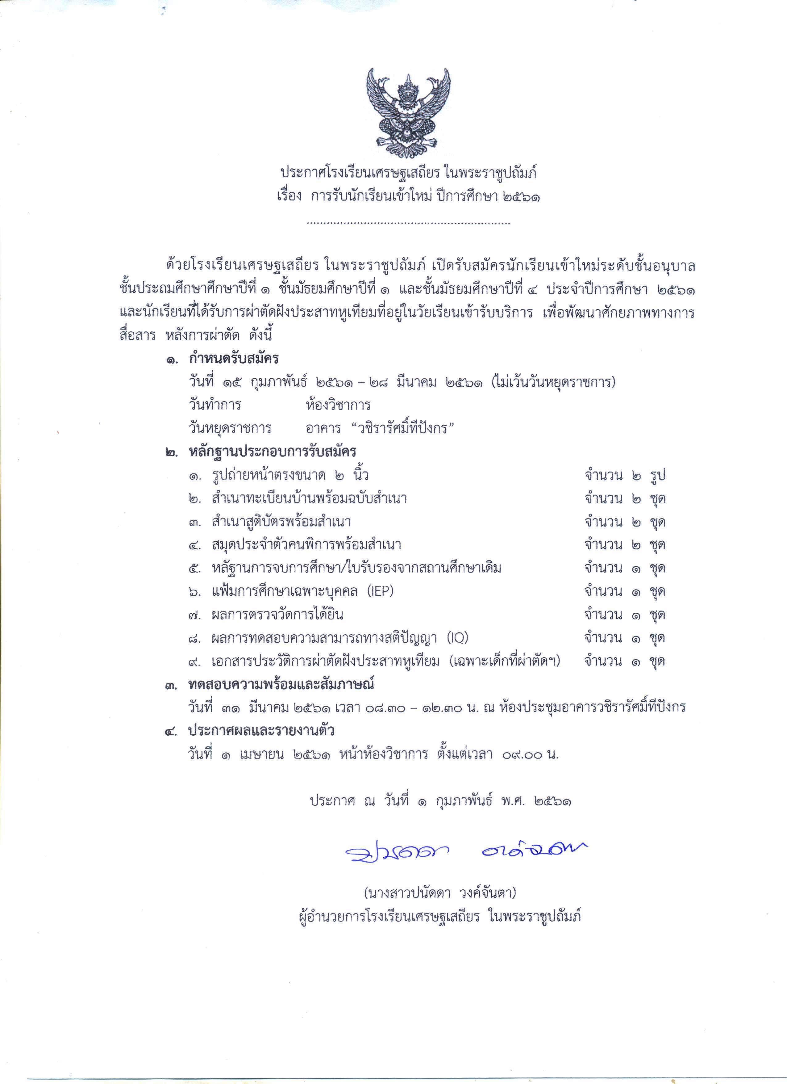 ประกาศรับนักเรียนเข้าใหม่ ปี 61