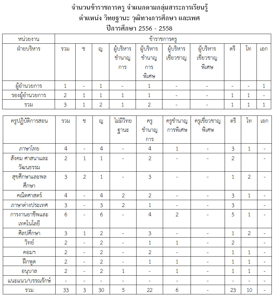จำนวนข้าราชการครู จำแนกตามกลุ่มสาระการเรียนรู้ ตำแหน่ง วิทยฐานะ วุฒิทางการศึกษา และเพศ ปีการศึกษา 2556 – 2558 29 มกราคม 2016