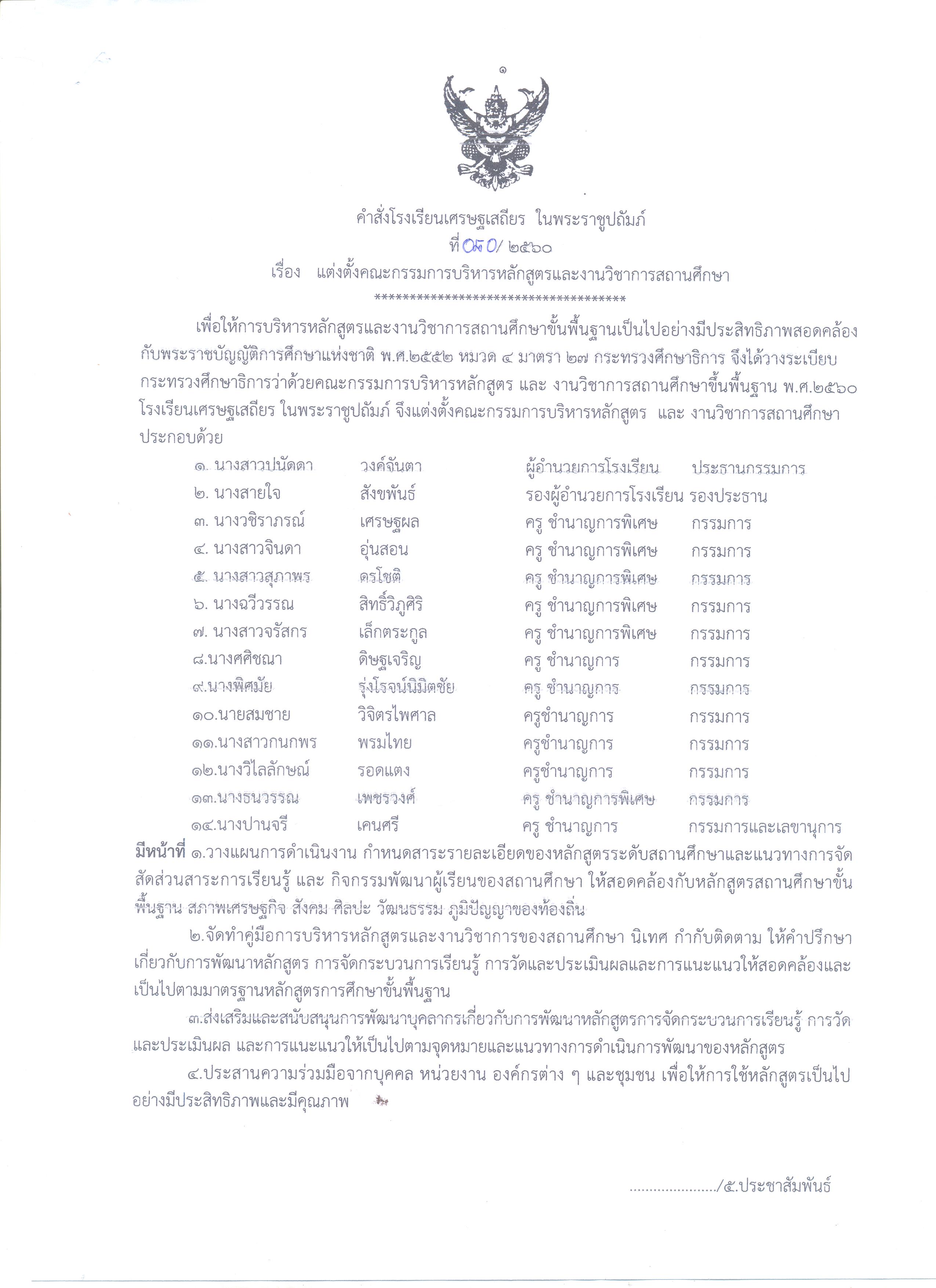 แต่งตั้งคณะกรรมการบริหารหลักสูตร 1 เมษายน 2017 คำสั่งโรงเรียนเศรษฐเสถียร ในพระราชูปถัมภ์ เรื่อง แต่งตั้งคณะกรรมการบริหารหลักสูตรและงานวิชาการสถานศึกษา